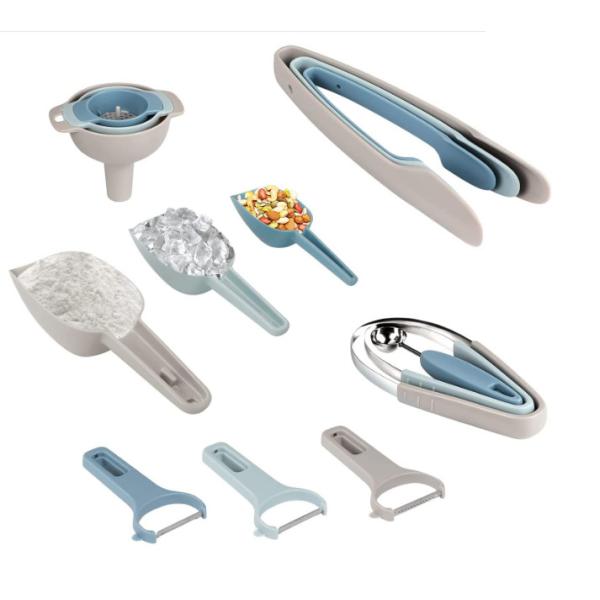 1. Includes 3 pcs potato Y peelers, 3 pcs oil funnel, 3 pcs flour scoop, 3 pcs melon ball scoop, 3 pcs salad tongs, 15 pcs in all. A set meet different needs and save your time,Made of food-grade PP plastic and stainless steel, BPA free, ensure food safety